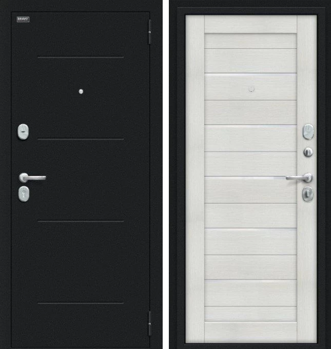 Надежная входная Браво Техно Kale Букле черное/Bianco Veralinga премиум класса по цене 34 297 руб. Большая толщина стали защитит от проникновения в ваш дом, квартиру или коттедж. Используется очень качественная фурнитура: замки, цилиндры, ручки, защелки. Покрытие и отделка двери изготовлено под внимательным контролем производителя. Дверь имеет долгий срок службы и гарантию.