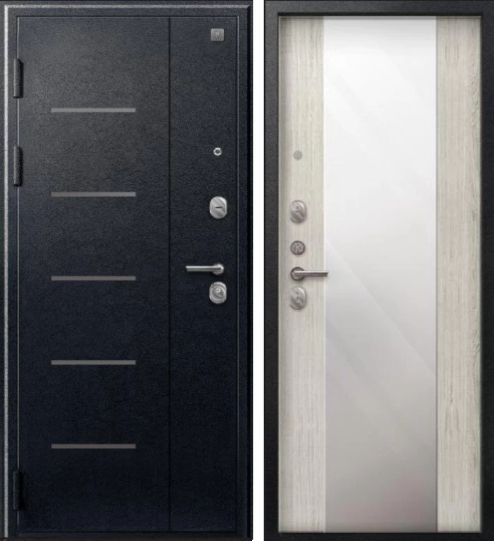 Надежная входная Дверь V-04 Черный муар - Полярный дуб Зеркало премиум класса по цене 42 647 руб. Большая толщина стали защитит от проникновения в ваш дом, квартиру или коттедж. Используется очень качественная фурнитура: замки, цилиндры, ручки, защелки. Покрытие и отделка двери изготовлено под внимательным контролем производителя. Дверь имеет долгий срок службы и гарантию.
